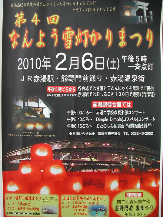 2月6日(土)に「なんよう雪灯かりまつり」が開催されます。今年も赤湯駅、赤湯温泉通り、宮内熊野門前通りの3会場で行われ、午後5時に手作りミニかまくらに一斉に点灯、甘酒と玉こんにゃくが振る舞われます。また各会場でイベントが盛りだくさんです(^^)