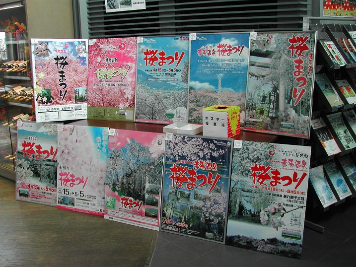ただ今赤湯駅待合室では「赤湯温泉桜まつり」のポスターコンペが開催中です。今回も色とりどりの綺麗な作品がたくさん届きました(^^)