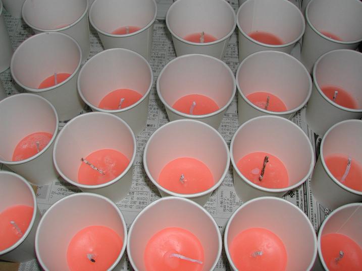 少し”ろう”が固まってきたところに、芯を挿していきます。数が多いので大変な作業です。