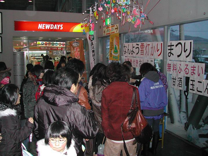赤湯駅の構内では、甘酒と玉こんにゃくのふるまい、おしるこの販売が行われました。すごい行列です!