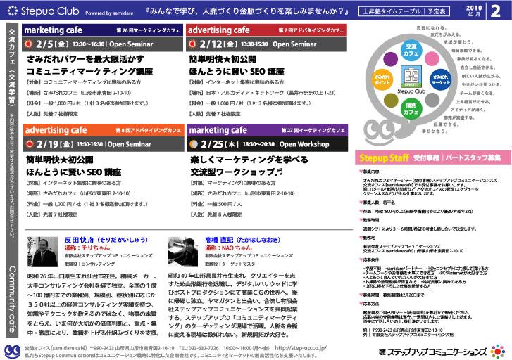 2月(如月)【交流カフェ】充実の4本です!▼さみだれパワーを最大限活かすマーケティング講座▼簡単明快★ほんとうに賢いSEO講座in長井市▼簡単明快★ほんとうに賢いSEO講座▼楽しく学べるマーケティングワークショップ参照→ 上昇塾 (Stepup club) ※お問い合せ及び、参加及び入会ご希望の方は こちらのフォームから受け付けております。 お気軽にお申し込みください。