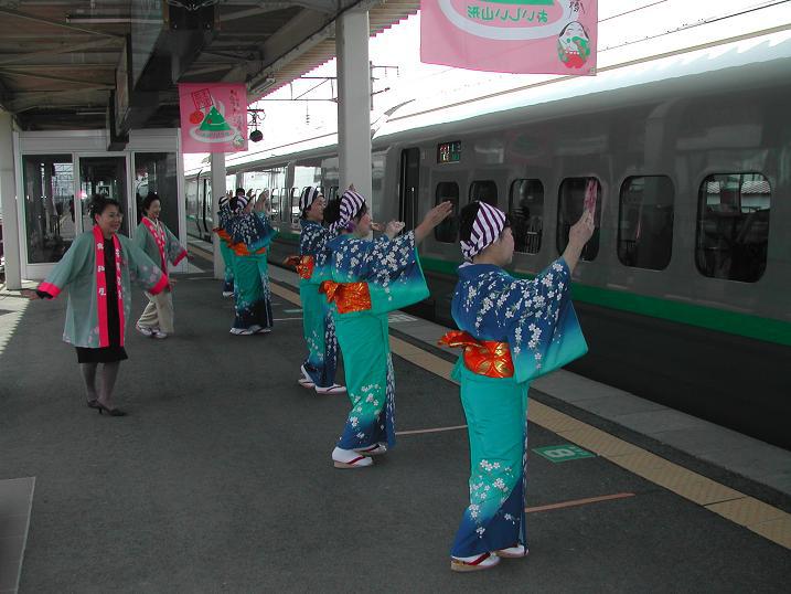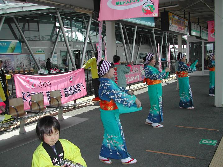 3日には赤湯駅でも「花回廊キャンペーン」のオープニングイベントが行われ、”赤湯音頭”で賑やかにお客様をお迎えしました。りんごジュースも振る舞われ、大変喜んでいただきました(^^)