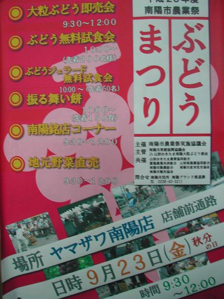 明日、9月23日(金)にヤマザワ南陽店さんで”南陽市農業祭”「ぶどうまつり」が行われます。