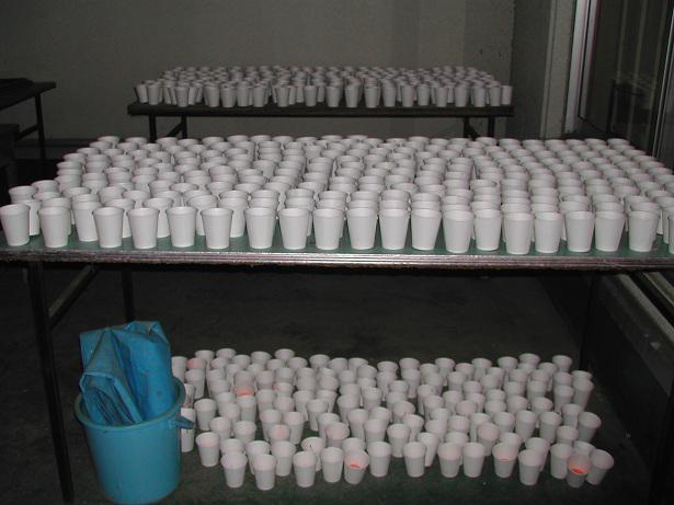 紙コップに”ろう”を流し込み、固まりかけたところに”芯”をさしていきます。