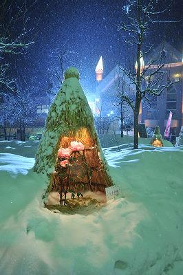 高畠駅太陽館のライトアップとコモのライトで