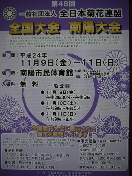 11月9日(金)〜11日(日)と「第48回㈳全日本菊花連盟全国大会 南陽大会」が、南陽市民体育館で行われます。
