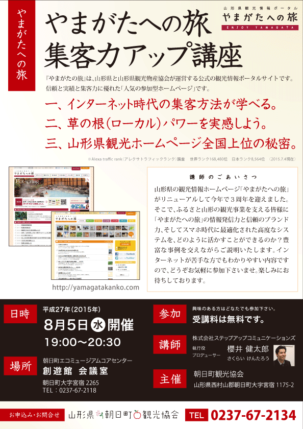 『やまがたの旅』は、山形県と山形県観光物産協会が運営する公式の観光情報ポータルサイトです。信頼と実績と集客力に優れた「人気の参加型ホームページ」です。 一、 インターネット時代の集客方法が学べる。二、 草の根(ローカル)パワーを実感しよう。三、 山形県観光ホームページ全国上位の秘密。 ▼開催日時 平成27年(2015年)8月5日 19:00〜20:30▼開催場所 朝日町エコミュージアムコアセンター創遊館 会議室 朝日町大字宮宿2265 TEL:0237-67-2118▼参加者 興味のある方はどなたでも参加下さい。受講料は無料です。▼講 師 株式会社ステップアップコミュニケーションズ 執行役プロデューサー 櫻井 健太郎▼主 催 朝日町観光協会 山形県西村山郡朝日町大字宮宿1175-2▼内 容〈今まさしく情報化時代〉 @ 地方でも小さくても苦手でもチャンス有り。 A コツコツ発信者にこそ追い風の時代。 B 情報の量と質は、売上げに比例する?〈地域をインターネットで盛り上げる〉 @ 五月雨をあつめて早し最上川 A やまがたへの旅のココがすごい! B 山形県内の多くの情報発信者たち・・・ 農家、お店、旅館ホテル、観光スポット等〈インターネット集客の方程式とは?〉 @ 情報戦略は天人地サイクルが大事 A 集客、参客、接客、成客、増客とは? B お金をかけず記事をかく。〈やまがたへの旅の参加と活用方法〉 @ インターネット環境の準備 A 会員登録および情報発信の方法 B まだまだ超活用できる上級編(おまけ)