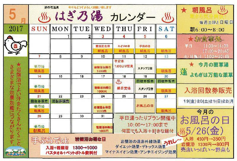 『5月はぎ乃湯カレンダー』ゴールデンウィーク期間中は休まず営業いたします!5月のお休みは5/11第2木曜日←注:いつもと違います。(午前中清掃のため休み、13:00〜営業)、5/18第3木曜日(定休日)になります。☆お得な入浴回数券セールは5/19(金)〜5/22(月)の期間中販売になります☆引き続き...お食事メ処ニューが新しくなりました!お楽しみに☆水曜日は岩盤浴お得な日☆今月のお風呂の日は5/26(金)で〜す毎週土曜日、日曜日は朝風呂営業日GW期間中の朝風呂営業は『はぎ乃湯カレンダー』をご確認ください。ご家族お友達みなさまのご利用お待ちしております!AM6:00〜AM8:00 朝から気分爽快!お問合せははぎ乃湯まで0238-88-5551↓↓↓「南の山形、たまには おきたま旅紀行。」はぎ苑ページはコチラ はぎ乃湯ページはコチラ