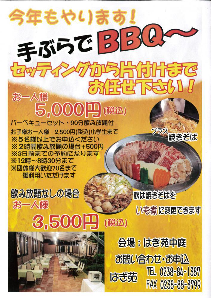 今年もやります!手ぶらでBBQ〜雨天でもOK!はぎ苑ガーデン内にビアテラス登場!!セッティングから片付けまではぎ苑にお任せください!【手ぶらでB.B.Q企画】の季節到来です!(^^)!6月〜芋煮会まで!5名様以上〜団体様(70名)まで大歓迎、夜はもちろん日中のご利用もお待ちしております。