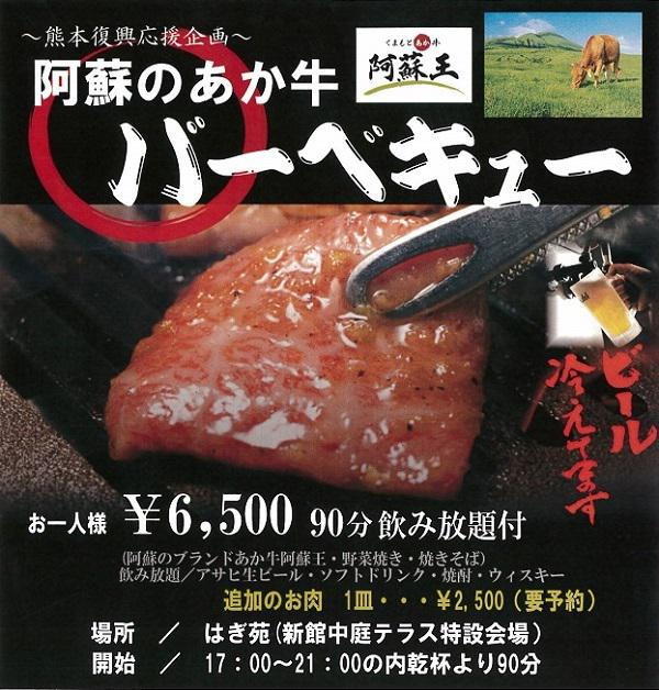 「熊本地震からの復興に向け、熊本を元気づけようと企画された『阿蘇ロックフェスティバル2017』が27日、熊本県南阿蘇村で開催され約1万人を集客、熱気に包まれた。」という爽やかなニュースがきこえてきた今日この頃。長井市はぎ苑では昨年に引き続き、熊本県阿蘇のあか牛をバーベキューでお楽しみいただけるようにご用意させていただきます!地元の料理人イチオシ企画です!期間限定ですが、一頭買いなので色々な部位を食べれるお得な企画となっております。ご指定日できる日は以下の通りです、数量限定につきご理解下さい。※時間は17:00〜21:00でお願いいたします。場所ははぎ苑中庭テラス特設会場になります。霜降り肉とは違った健康志向な赤身肉の甘味を是非B.B.Qでお楽しみください!(昨年度はその美味しさ大好評でした)ご予約・お問合せは・・はぎ苑 0238‐84‐1387http://www.hagien.co.jp/ ↓↓↓「南の山形たまにはおきたま旅紀行。」はぎ苑ページはコチラ はぎ乃湯ページはコチラ