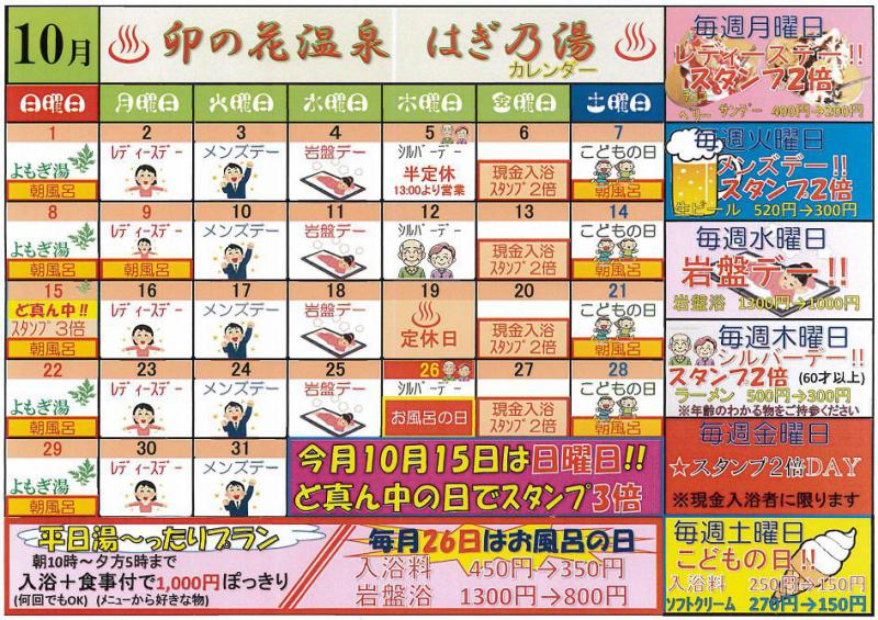 ▼芋煮会の季節10月はぎ乃湯カレンダー/はぎ苑
