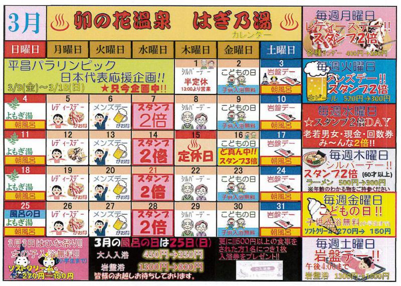 ▼3月はぎ乃湯カレンダー/はぎ苑