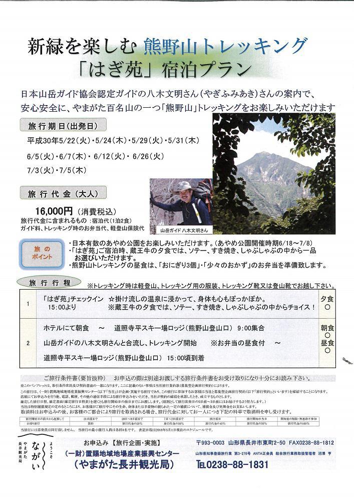新緑の季節になり やまがた長井観光局様より『新緑を楽しむ熊野山トレッキング はぎ苑宿泊プラン』がいよいよスタートです!日本山岳ガイド協会認定ガイドの八木文明(Fumiaki Yagi)さんの案内で安心安全に、やまがた百名山の一つ「熊野山」トレッキングをお楽しみいただけます!お申込み/お問合せは・・やまがた長井観光局0238-88-1831はぎ苑スタッフ一同 みなさまのご参加を心より待ちしております。 ↓↓↓「南の山形たまにはおきたま旅紀行。」 はぎ苑はコチラ