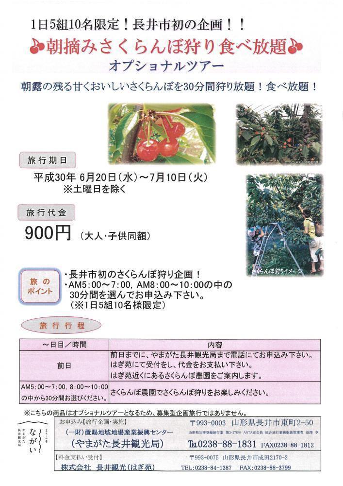 はぎ苑近くのさくらんぼ畑で朝摘みさくらんぼ狩り食べ放題!下記の日程でお申込みいただけます。ご宿泊と合わせてよろしくお願いいたします。1日5組10名限定!!長井市初の企画!朝摘みさくらんぼ狩り食べ放題 オプショナルツアー!!平成30年6月20日(水)〜7月10日(火)※土曜日を除く900円(大人・子供同額) ・長井市初のさくらんぼ狩り企画!・時間はAM5時〜7時、AM8時〜10時の中から30分間お選びいただき、前日までやまがた長井観光局まで電話にてお申込み下さい。(※1日5組10名様限定) やまがた長井観光局ページはコチラからご覧いただけます。【1日5組10名限定!!長井市初の企画!朝摘みさくらんぼ狩り食べ放題 オプショナルツアー!!】http://kankou-nagai.jp/plan-article/?plan_id=120 熊野山トレッキングとさくらんぼ狩りを一緒に楽しむことも可能になりました!こちらも合わせてよろしくお願いいたします。【新緑を楽しむ熊野山トレッキング「はぎ苑」宿泊プラン】http://kankou-nagai.jp/plan-article/?plan_id=118 ↓↓↓お申込みは↓↓↓やまがた長井観光局 TEL:0238-88-1831受付時間 平日9:00〜17:00 お問合せは・・卯の花温泉はぎ乃湯・はぎ苑 0238‐84‐1387www.hagien.co.jp/ ↓↓↓「南の山形たまにはおきたま旅紀行。」 はぎ苑はコチラ