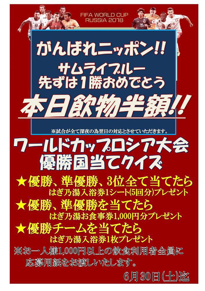 昨日行われたワールドカップロシア大会、見事サムライブルー勝利しましたぁぁぁ!!!おめでとうございます!初戦の日本対コロンビア戦で、2-1で勝ちました!!ということで、はぎ乃湯では「本日、飲物半額」になります(^_-)-☆是非、お越しください!さらに、優勝国当てクイズ開催中!(^^)!・優勝・準優勝・3位全て当てたら…はぎ乃湯入浴券1シート(5回分)プレゼント!・優勝・準優勝を当てたら…はぎ乃湯お食事券1,000円分プレゼント!・優勝チームを当てたら…はぎ乃湯入浴券1枚プレゼント!※お1人様1,000円以上の飲食利用者全員に応募用紙をお渡しいたします。6月30日(土)迄【特別セット販売中】日本代表応援セットとして、生ビールとおつまみ3品ついて、1,000円で販売致します。※日本代表応援セットは、ワールドカップが終了するまで行います皆さんで日本代表を応援しましょう〜(^^)/お問合せは・・卯の花温泉はぎ乃湯・はぎ苑 0238‐84‐1387www.hagien.co.jp/ ↓↓↓「南の山形たまにはおきたま旅紀行。」 はぎ苑はコチラ