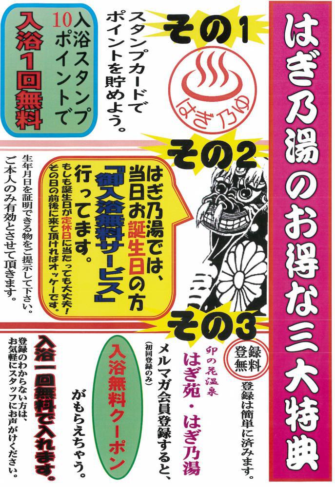 ▼はぎ乃湯のお得な三大特典/はぎ苑