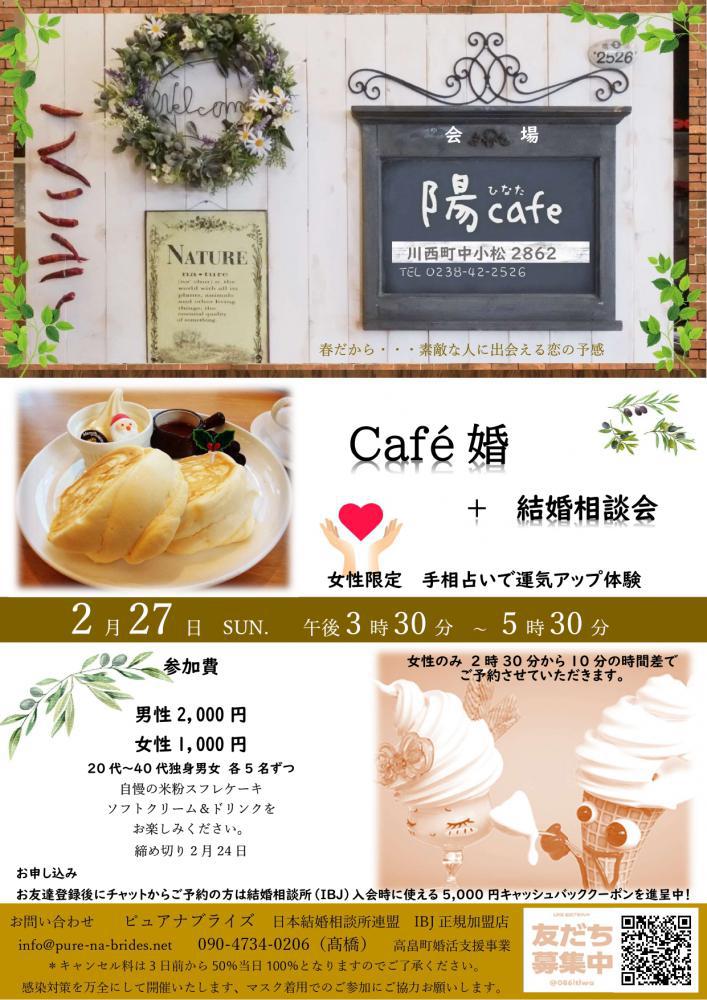 2月27日(日)カフェ婚+結婚相談会を行います。 午後3時半〜午後5時半 参加費 男性¥2,000 女性¥1,000 20代〜40代の独身男女各5名ずつ 女性限定で当日私が手相を見させていただきます。 今後の婚活にお役立ていただければ幸いです。 お問い合わせピュアナブライズ090-4734-0206(高橋) 問い合わせに関しては、当店ではなくこちらにお問い合わせください。 パンケーキを食べながら素敵なお相手を探してみませんか?