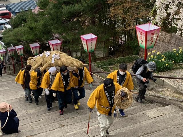本日、烏帽子山鳥居の注連縄架けかえが行われました。赤湯小学校6年生鼓笛隊を先頭にパレードが行われた後、鳥居まで注連縄が運ばれました。