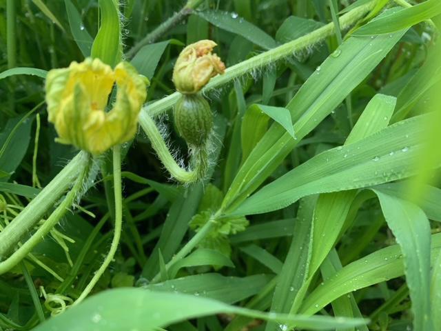 しばらくぶりで畑に出ると、そこはジャングルと化しておりました。2本植えたはずの茄子は1本しか姿が見えず…。もう1本は南瓜に飲み込まれており救出不可能な状況にまで追い込まれておりました。そもそもよく考えずに苗を植えていくので、南瓜のスペースがめっちゃ狭かったのが原因です。そのくせちょろっとスペースが空いてしまい、そこにホームセンターで瀕死の状態だった小玉スイカの苗を初めて植えました。「こりゃあダメかな」と思っていたのですが、それも四方八方に伸びに伸びミツバチくらいの大きさの実が付いていました。実? (゜-゜) なの?これに受粉しなくてはいけなかったのかも?