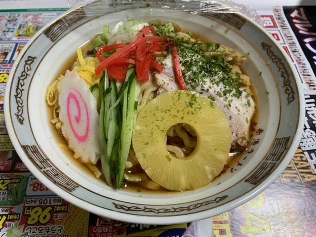 龍上海赤湯本店(0238-43-2952)の冷やし中華。たぶん、皆さん辛みそラーメンは見慣れていると思うので、あえての冷やし中華です。私も初めて食べました。パイナップルが丸丸一切れ入ってるのが嬉しいです。なんだろう…。どんぶりに入っているからなのか、冷たいラーメンを食べているような気になってしまう…。味は冷やし中華なのに (笑)ただ、マヨネーズが付いていませんでした。(/o\) マヨ、マヨがネーズよ。