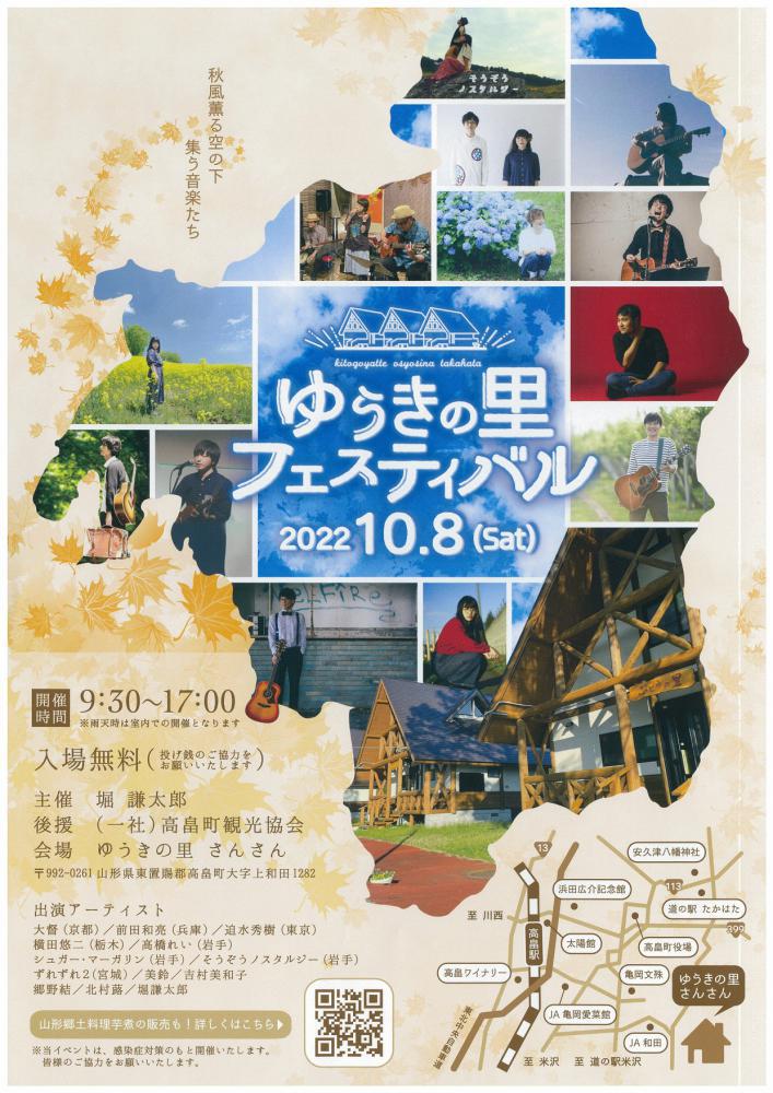 ↑チラシはこちらゆうきの里さんさんで野外フェスを初開催します♪山形郷土料理の芋煮の販売もあります。詳しくはチラシとイベント詳細ページをご覧ください。イベント詳細ページ・開催日時:2022年 10月8日 9:30〜17:00・会場:ゆうきの里さんさん(東置賜郡高畠町大字上和田1282)・入場無料(投げ銭のご協力をお願いいたします)