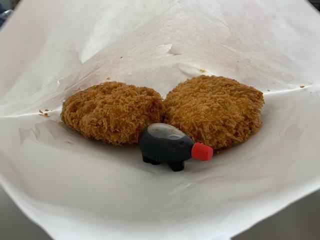 辰巳屋牛肉店(0238-43-2029)のコロッケ。中を覗き込んだら、ぶたちゃんと目が合いました(笑)サクサク衣のコロッケちゃん。