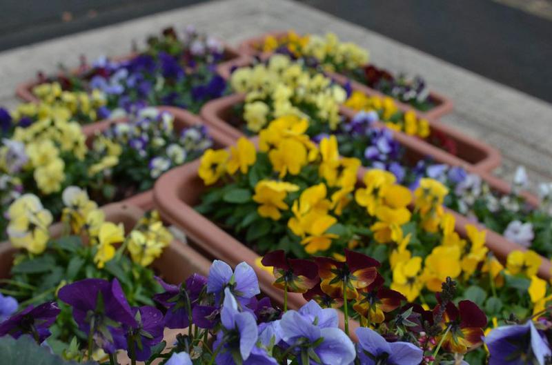 冷たい雨に濡れても奇麗なビオラ。赤湯中学生が職場体験の際に植栽してくれました。