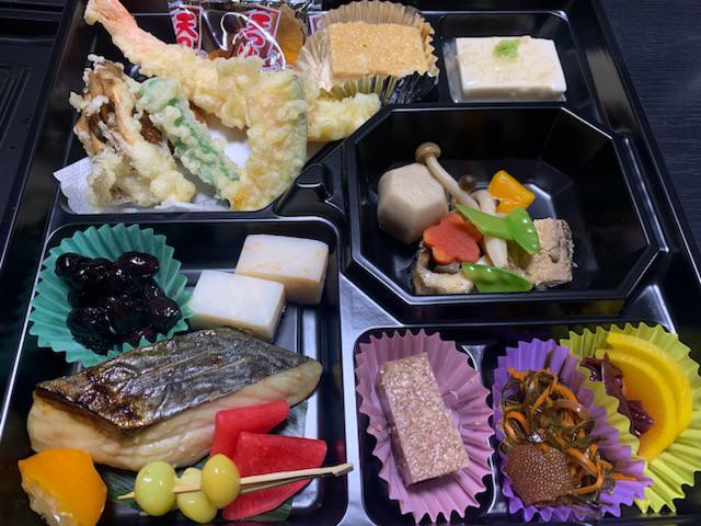 金田屋魚店(0238-43-2014)の折箱です。折箱にプラスしてお刺身がつきました。どれも美味しかったのですが、、、(中トロだったし)私は金柑が一番美味しかったです。