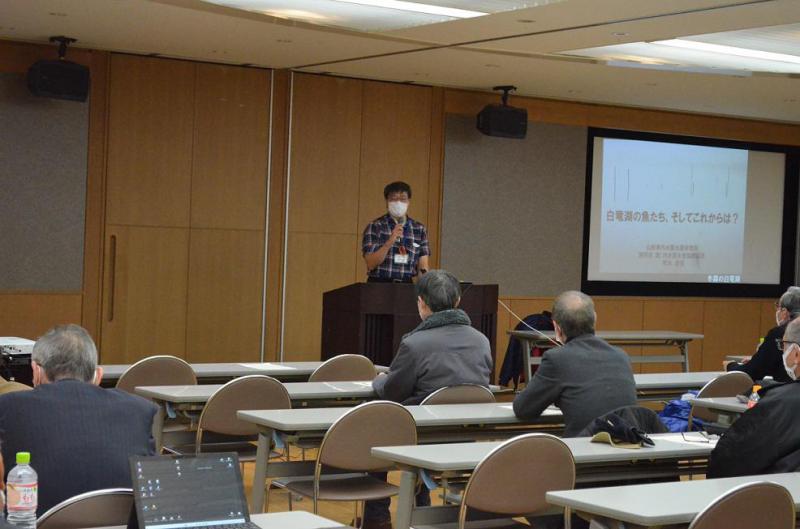 白竜湖の自然を守る会では、県内水面水産研究所の荒木副所長を講師にお招きし、『白竜湖の魚たち、そしてこれからは?』と題した講演をしていただきました。とても分かりやすく楽しい講演でした。あまりに単純な質問で…、会場ではお聞きできなかった「ブラックバスだけになった湖でブラックバスは生き残れるのか?」という質問にも(こっそり事務室で)答えていただきました。