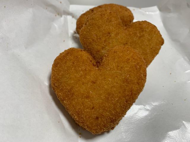 辰巳屋牛肉店(0238-43-2029)のバレンタイン・デー用(?)コロッケ。中は甘いさつま芋です。…(゜-゜)…でも食べる時にハートが壊れちゃうんだよね(笑)明日までの限定品です。愛を込めて、お弁当箱に入れてみてはいかがでしょうか。