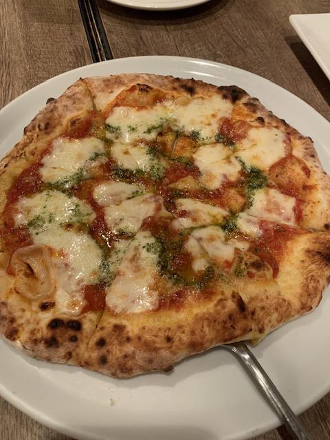 オステリア エスト(0238-43-6006)のマルゲリータとシーフードのピッツァ。さらに唐揚げ。シーフードの…、魚介の香りがうまい!香りだけでもうま、うま。