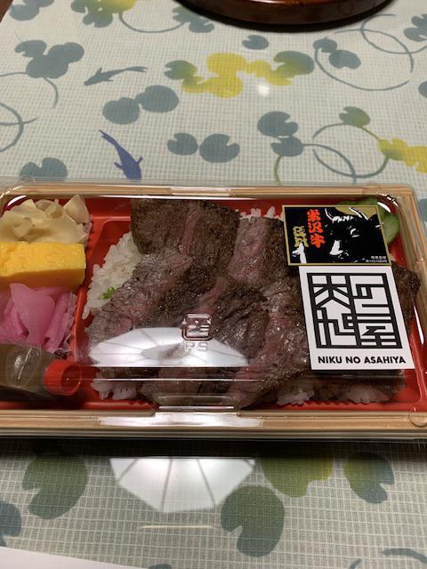 肉の旭屋(0238-43-2639)の米沢牛ステーキ丼、弁当。すっごく贅沢なお弁当です。時間が経ってから食べたのですが、冷めててもしっかり美味しいです。イヤな牛臭さ、一切なし。でした。