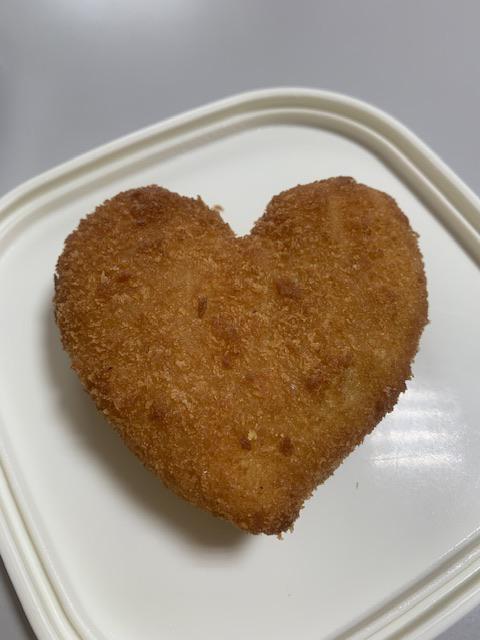 ハッピーバレンタインでした。辰巳屋牛肉店(0238-43-2029)のハートコロッケ。中は甘いサツマイモのコロッケでした。