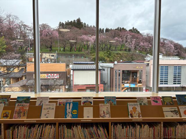 今日はあいにくの雨です。満開の時ではなくて良かったのかもしれません。図書館の窓から桜をみました。