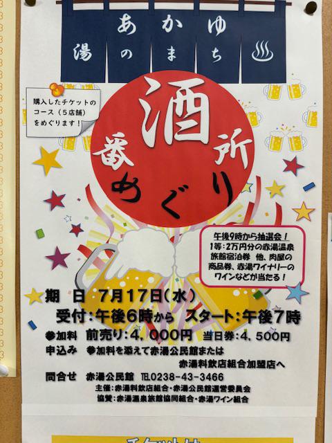 「ゆのまち酒番所めぐり」を7月17日(水)に開催します。購入いただいたチケットのコース(5店舗)をめぐっていただきます。5店舗全部をめぐっていただきますと9時からの抽選会に参加できます。抽選会では一等:赤湯温泉旅館2万円分の宿泊券、他赤湯ワイナリー6社のワインや肉屋の商品券が当たるチャンスが!チケットは6月16日(月)から赤湯料飲店組合加盟店、赤湯公民館で販売されます。