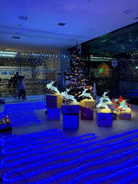 屋内イルミネーションの点灯時間を3時30分すぎに変更しました。早い時間に小さなお子様が来館されることが多いためです。ちょっと外が明るいですが、屋内の照明をおとしていますので、楽しんでいただけるかと思います。