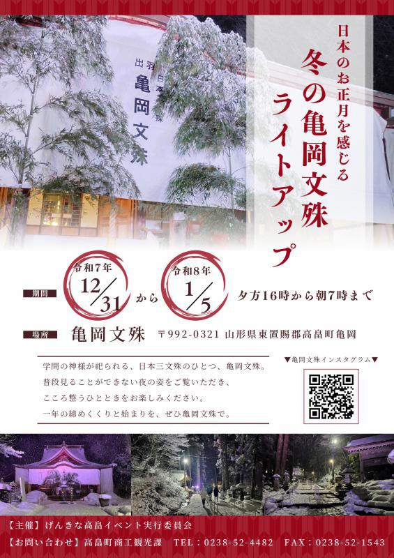 日本三大文珠のひとつである亀岡文珠は学問成就のパワースポットとして有名です。普段見ることのできない夜の亀岡文珠を鮮やかにライトアップいたします!こころ整うひとときをお楽しみください。一年の締めくくりと始まりをぜひ亀岡文珠で!<期間>令和7年12月31日(水)〜令和8年1月5日(月)夕方16時〜朝7時まで<場所>亀岡文珠(山形県東置賜郡高畠町大字亀岡)<主催> 元気なたかはたイベント実行委員会<お問合せ> 高畠町商工観光課 TEL 0238-57-4482