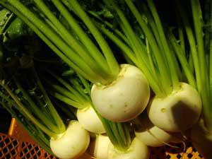 どしゃぶりの雨の中、自家農園のカブ収穫。
