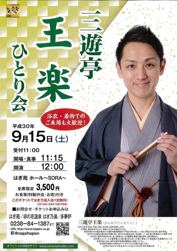 三遊亭 王楽 ひとり会平成30年9月15日(土)受付11:00開場・食事 11:15 開演 12:00はぎ苑 ホール〜SORA〜《浴衣・着物でのご来場も大歓迎!》全席指定 3,500円 お食事(特製弁当・お茶)付きチケットの半券ではぎ乃湯入浴1回無料!(2018年10月31日まで有効) 三遊亭 王楽(さんゆうてい おうらく)父は三遊亭 好楽。平成13年に五代目三遊亭円楽に入門。 27番目、最後の弟子となり、同時に父とは兄弟弟子となる。 師匠円楽からは過去最多の10演目を直接師事され、平成16年5月に二つ目に平成21年10月に真打昇進。 伸びやかな感性と現代性が特徴であり、持ちネタは現在200に迫る勢い。 二ツ目・真打昇進時には、師匠である五代目三遊亭円楽をはじめ、史上最高ともいえる豪華出演者が脇を固め、注目を集めた。 NHK新人コンクール大賞受賞した「鼓ヶ滝」をはじめ、「片棒」「夢金」「三枚起請」「五貫裁き」といった古典作品に加え、 自作の新作落語を積極的に発表している。 自作新作落語の代表作は「パパずれてるゥ!」「祭りのあと」など。出演TV「あさイチ」「笑点」Eテレ「にほんごであそぼ」ほか多数出演オフィシャルWEBサイト www.sanyuteiouraku.com ■お問合せ・チケットお申込みははぎ苑/卯の花温泉 はぎ乃湯/多夢炉0238ー84ー1387URL http://www.hagien.co.jp @nagaihagien