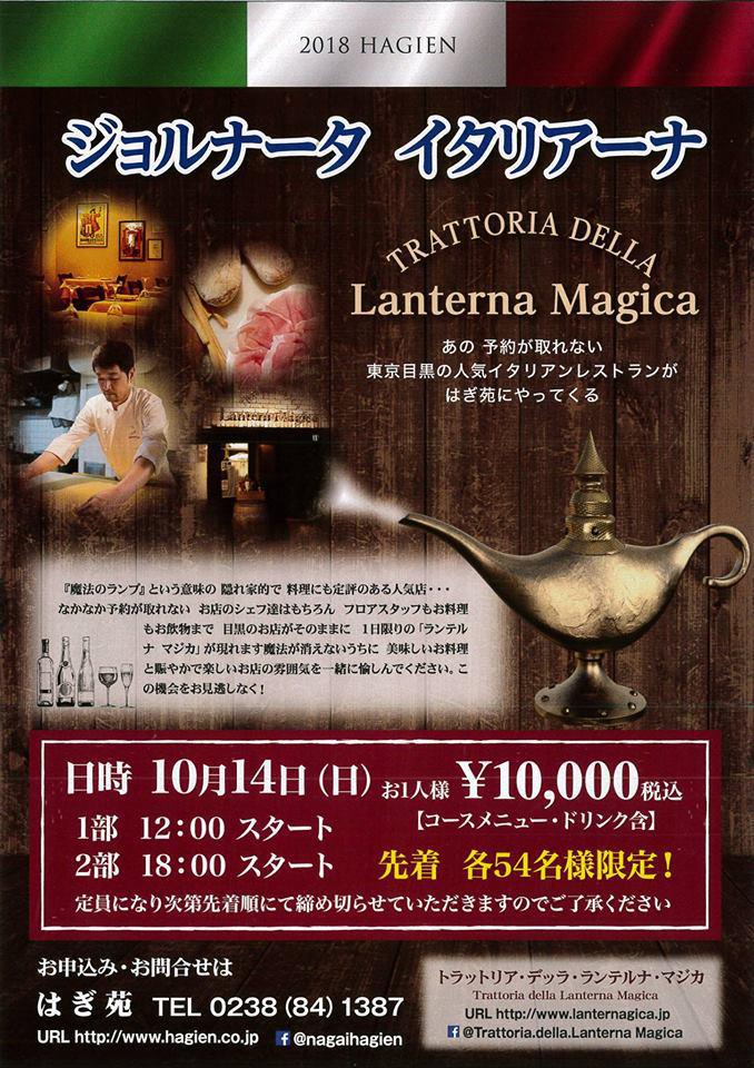 6月の第1回も大好評でしたジョルナータ イタリアーナランテルナ・マジカが再び。予約が困難な東京目黒の人気イタリアンレストランがはぎ苑に来苑します。シェフ、フロアスタッフ、お料理、飲み物まで全てお店そのままに1日限りです。10月14日(日)○1部○12時スタート facebookイベントページはコチラ○2部○18時スタート facebookイベントページはコチラお一人様税込10.000円となります。1部2部ともに先着54名様となりますのでご予約はお待ちしております。お問合せは・・卯の花温泉はぎ乃湯・はぎ苑 0238‐84‐1387www.hagien.co.jp/