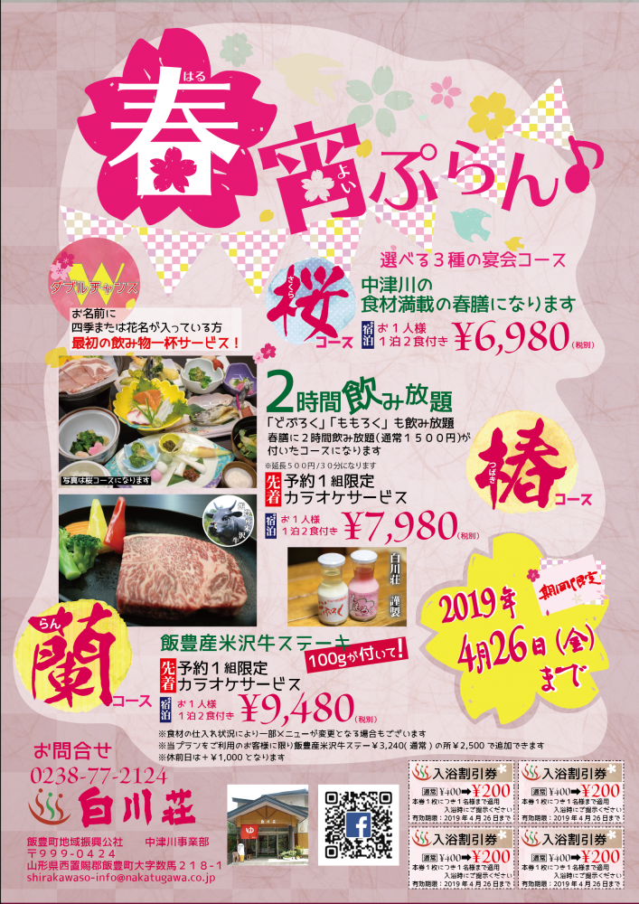 待ちに待った春・春・春が来たーぁ。白川荘周辺も春満載です。とってもお得な「春宵プラン」が4月からスタートします。三つのコースのいずれかを選んで下さい。ご予約はお早めに。