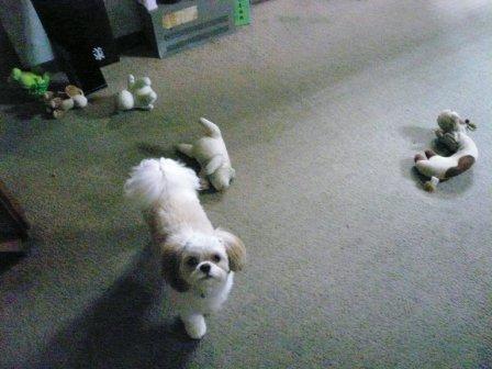 自動車学校の生徒さん達が多く「スピちゃんカワイイ」などと言われ、調子にのって、自分のおもちゃをあるだけ出してきて、遊んでもらおうと思っているみたいです。これを片付けるのは、毎回私です・・・片付けても出してきて・・・の繰り返し・・・それにちゃっかりカメラ目線なんです。
