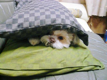 クッションを自分の上と下に、サンドウィッチ状態です。
