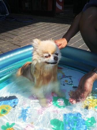 今日は、あまりにも天気が良かったので、「スピア」と2時避難で宿泊されているSさんの「ちょこら」ちゃんで、プールに入りました。