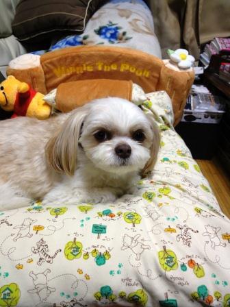 当館の看板犬「スピア」、夜は、私と一緒のベッドで寝ております。