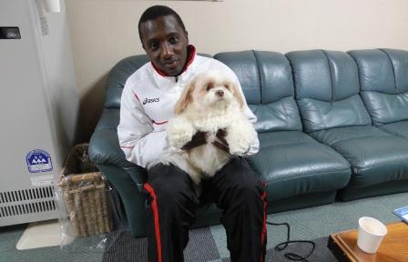 ▼全国初!?コスマスに抱っこしてもらった犬「スピア」