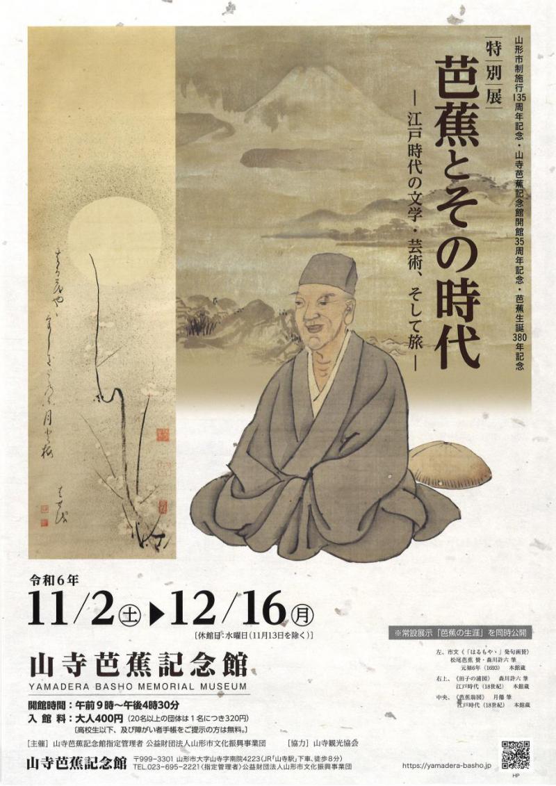 山寺芭蕉記念館開館35周年・芭蕉生誕380年記念特別展「芭蕉とその時代−江戸時代の文学・芸術、そして旅−」会期:11月2日〜12月16日 (休館日:水曜日〔11月13日を除く〕) 江戸時代の俳人松尾芭蕉は、元禄2年(1689)の「奥の細道」の旅を経て、「不易流行」の俳諧理念に到達し、元禄7年、日本文学史上に残る紀行文『おくのほそ道』を完成させました。 江戸時代は、諸街道や航路の整備、物資流通の活発化などにより、庶民の間でも旅が一般化します。文学も雅俗が共存する多様化・大衆化の道をたどり、下級武士や町民なども文学の担い手となっていきます。また、茶道や文人の書画が独自の文化を形作りました。そうした中、俳諧の分野では、全国的に影響力があった流派「貞門」の北村季吟に学んだ松尾芭蕉は、それまで言語的遊戯であった俳諧を芸術の域まで高めたのでした。 本展では、芭蕉の生き方、感性に影響を与えた、文学・芸術、そして旅の一端をご紹介します。芭蕉文学を理解する手がかりとしていただければ幸いです。 関連イベントギャラリートーク日 時 令和6年11月10日(日)午後1時30分から(約25分)参加費 入館料400円のみ(高校生以下、及び障がい者手帳をご提示の方は無料。) 〔事前申し込み不要〕