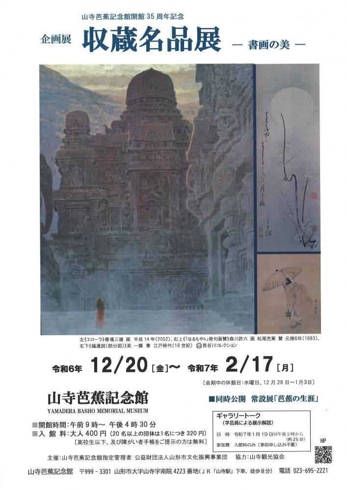 山寺芭蕉記念館開館35周年記念企画展「収蔵名品展 −書画の美−」会期:12月20日〜2月17日 (休館日:水曜日、12月28日〜1月3日) 山寺芭蕉記念館の収蔵品より名品を選び公開します。芭蕉の書や山(〇に山)長谷川コレクション、潁原(えばら)退蔵・尾形仂(つとむ)コレクションなどから俳文学や歴史資料の名品を、また注目すべき絵画作品を選りすぐって展示します。文学的、美術的価値の高い作品をぜひご鑑賞ください。 関連イベントギャラリートーク 日 時 令和7年1月19日(日)午後2時から(約25分)参加費 入館料400円のみ(高校生以下、及び障がい者手帳をご提示の方は無料。) 〔事前申し込み不要〕