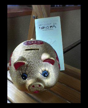 手前の金色ブタくん、ミナクアの500ccボトルの料金入れになっています。チャリ〜ンとお金を入れる時に頭をなでてあげると、ゴリヤク有り!という話があるとかないとか・・・。
