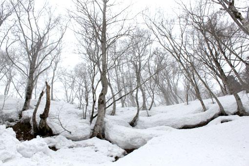 登りでは未だ雪温が低くなんとかグリップを保てたのでトラバース出来たが、下山時には簡易アイゼンは役立たず状況で、もしも滑落してその辺のブナの木に頭をぶつけてノビてしまっても洒落にならないんで、仕方なく20m程高巻きする。ちなみに、犬っ子達は4輪ドリフトならぬ「4足ドリフト(気味)」で、難なくトラバースして行った。